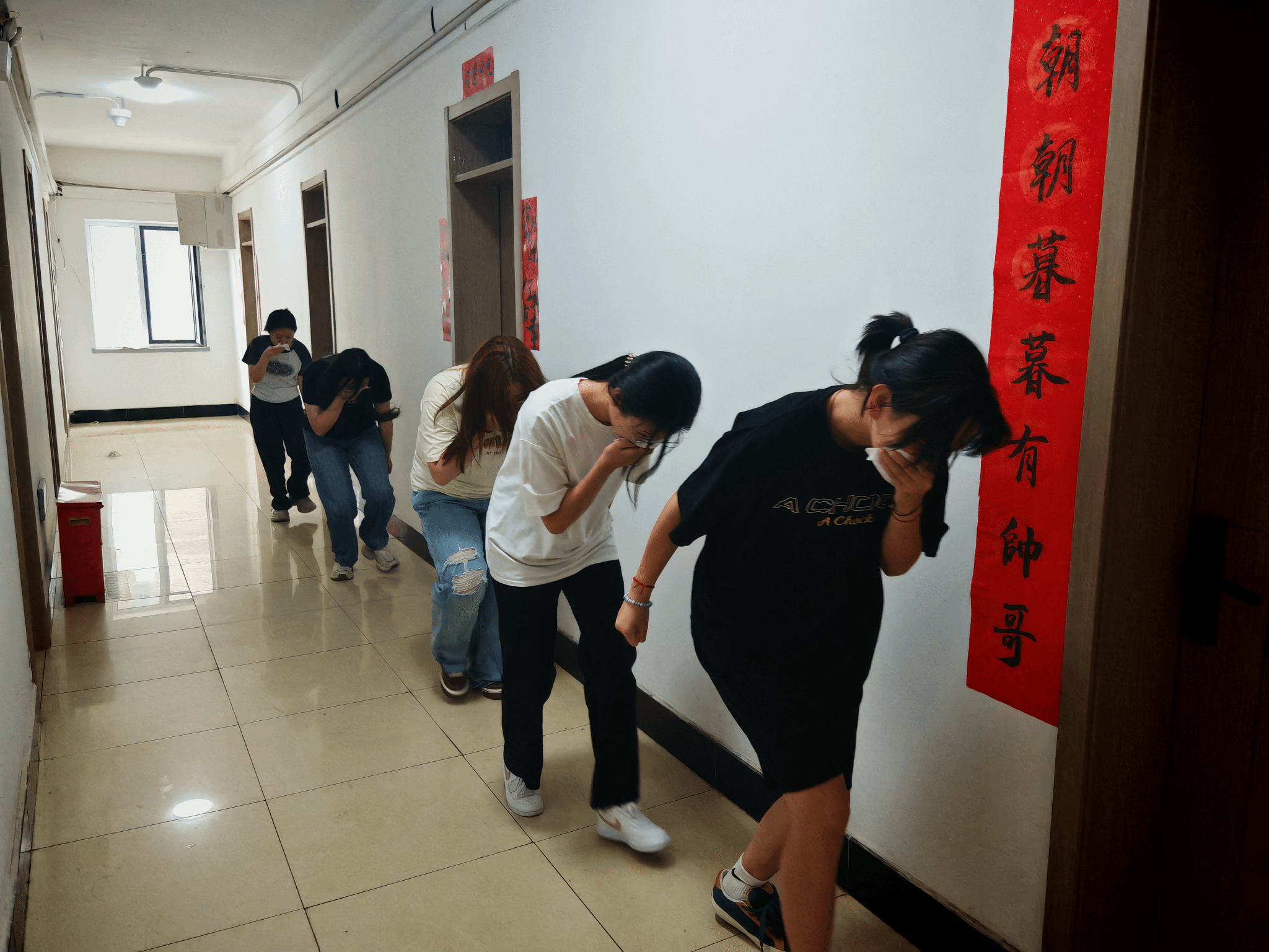 演练前期,v站体育官网精心筹备,制定了详细的演练方案,明确了各部门和人员的职责分工。随着警报声的响起,消防演练正式拉开帷幕,九号楼学生在辅导员和志愿者的引导下,迅速从寝室撤离,按照预定路线有序向空地集合。在撤离过程中,学生们用湿毛巾捂住口鼻,低姿前行,避免吸入有毒烟雾,整个撤离过程紧张有序,无拥挤、摔倒等意外情况发生。